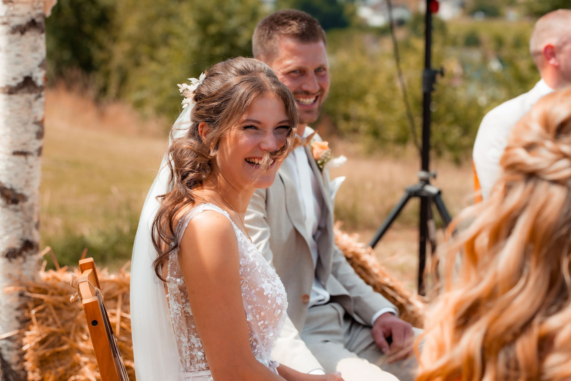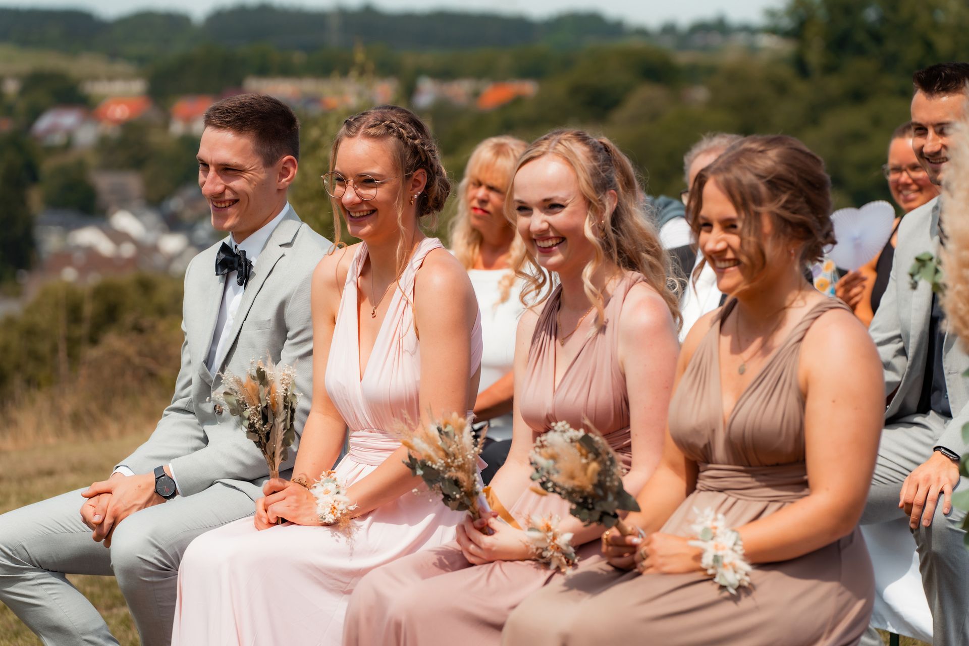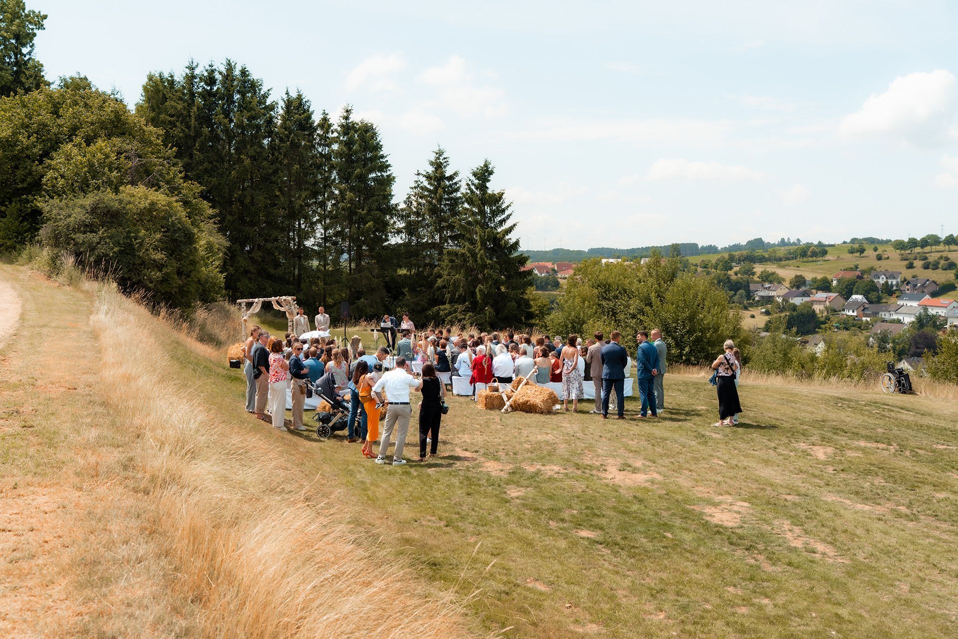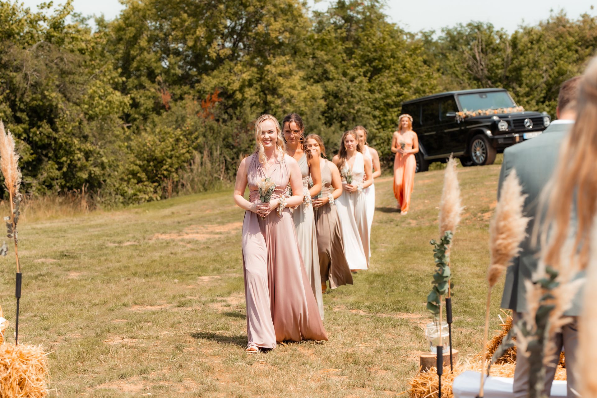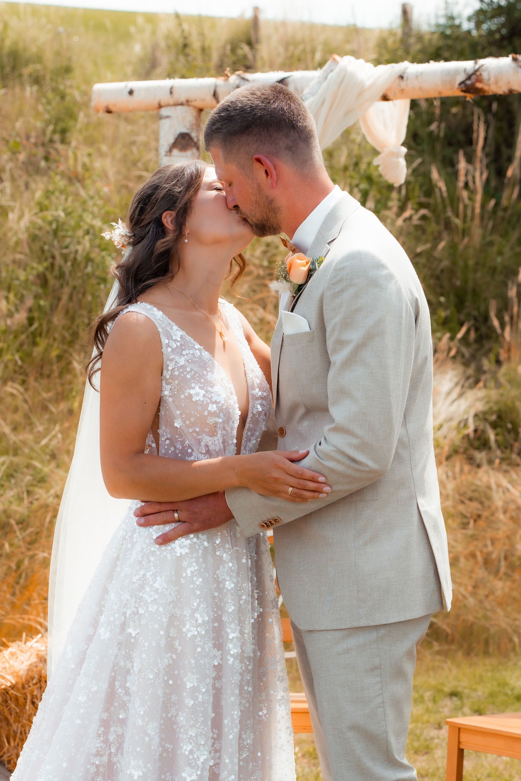 Es gibt Momente im Leben, die man nie vergisst – und die freie Trauung von Maresa und Florian war genau so ein Moment. An einem warmen Sommertag auf einem goldenen Feld in Dahlem trafen sich zwei Herzen zum ersten Mal in diesem ganz besonderen Augenblick. Die Gäste kamen nach und nach an und ich hielt all die kleinen, liebevollen Details fest: das Lächeln beim Ankommen, die freudigen Umarmungen und die strahlenden Augen. Zunächst zogen die Brautjungfern ein, dann die Trauzeugin, bevor Maresa endlich erschien – ein Moment voller Emotion, der allen den Atem raubte. Florian wurde dabei liebevoll von seinem Trauzeugen unterstützt. Die Zeremonie wurde von der wunderbaren