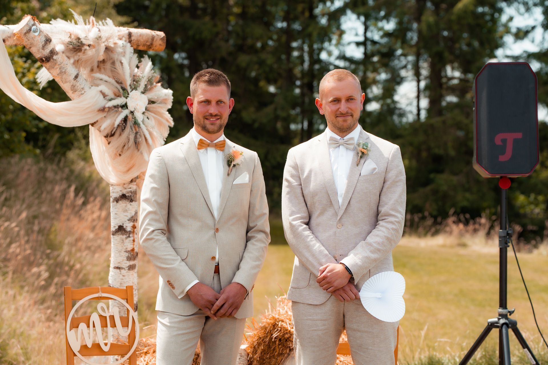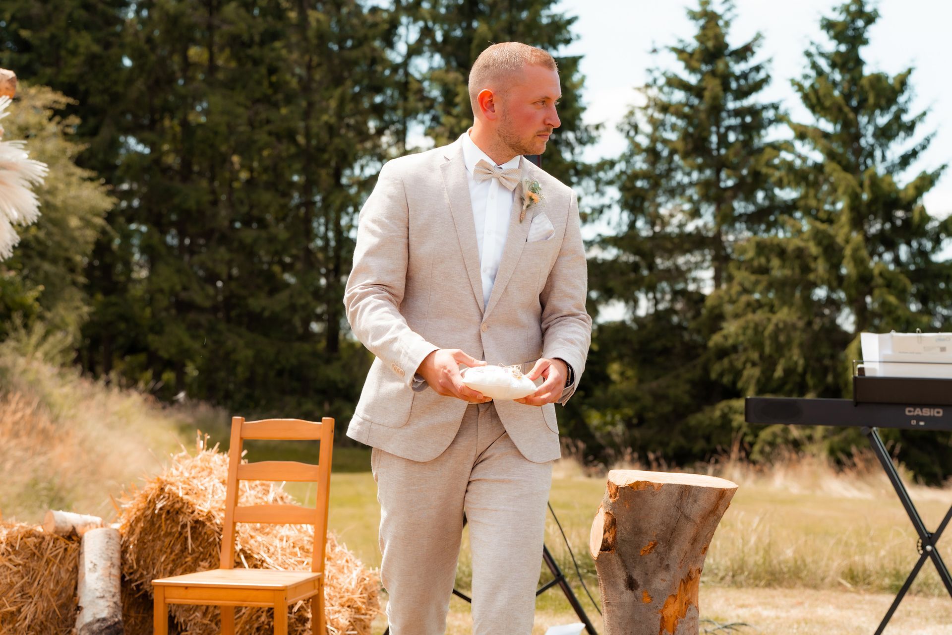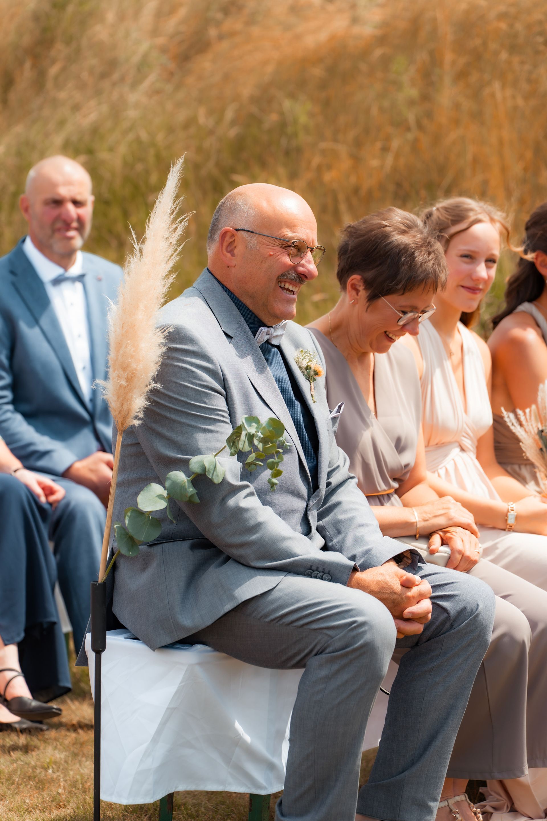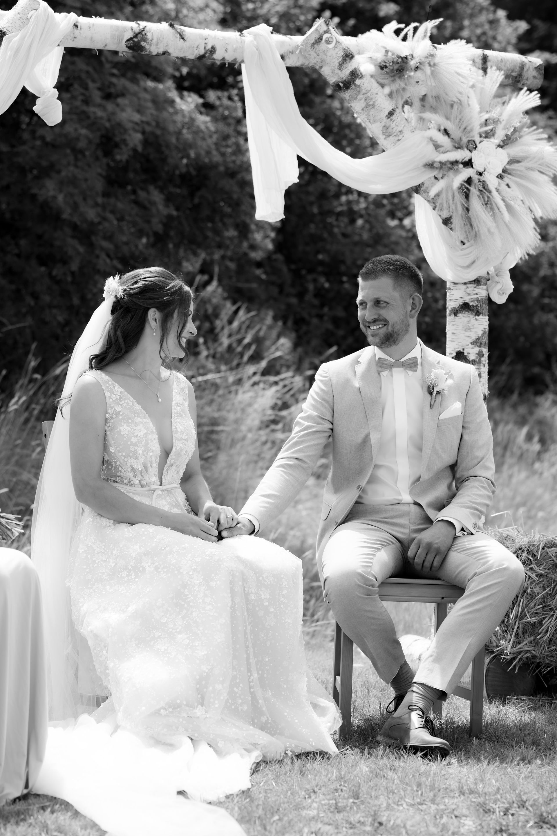 Es gibt Momente im Leben, die man nie vergisst – und die freie Trauung von Maresa und Florian war genau so ein Moment. An einem warmen Sommertag auf einem goldenen Feld in Dahlem trafen sich zwei Herzen zum ersten Mal in diesem ganz besonderen Augenblick. Die Gäste kamen nach und nach an und ich hielt all die kleinen, liebevollen Details fest: das Lächeln beim Ankommen, die freudigen Umarmungen und die strahlenden Augen. Zunächst zogen die Brautjungfern ein, dann die Trauzeugin, bevor Maresa endlich erschien – ein Moment voller Emotion, der allen den Atem raubte. Florian wurde dabei liebevoll von seinem Trauzeugen unterstützt. Die Zeremonie wurde von der wunderbaren
