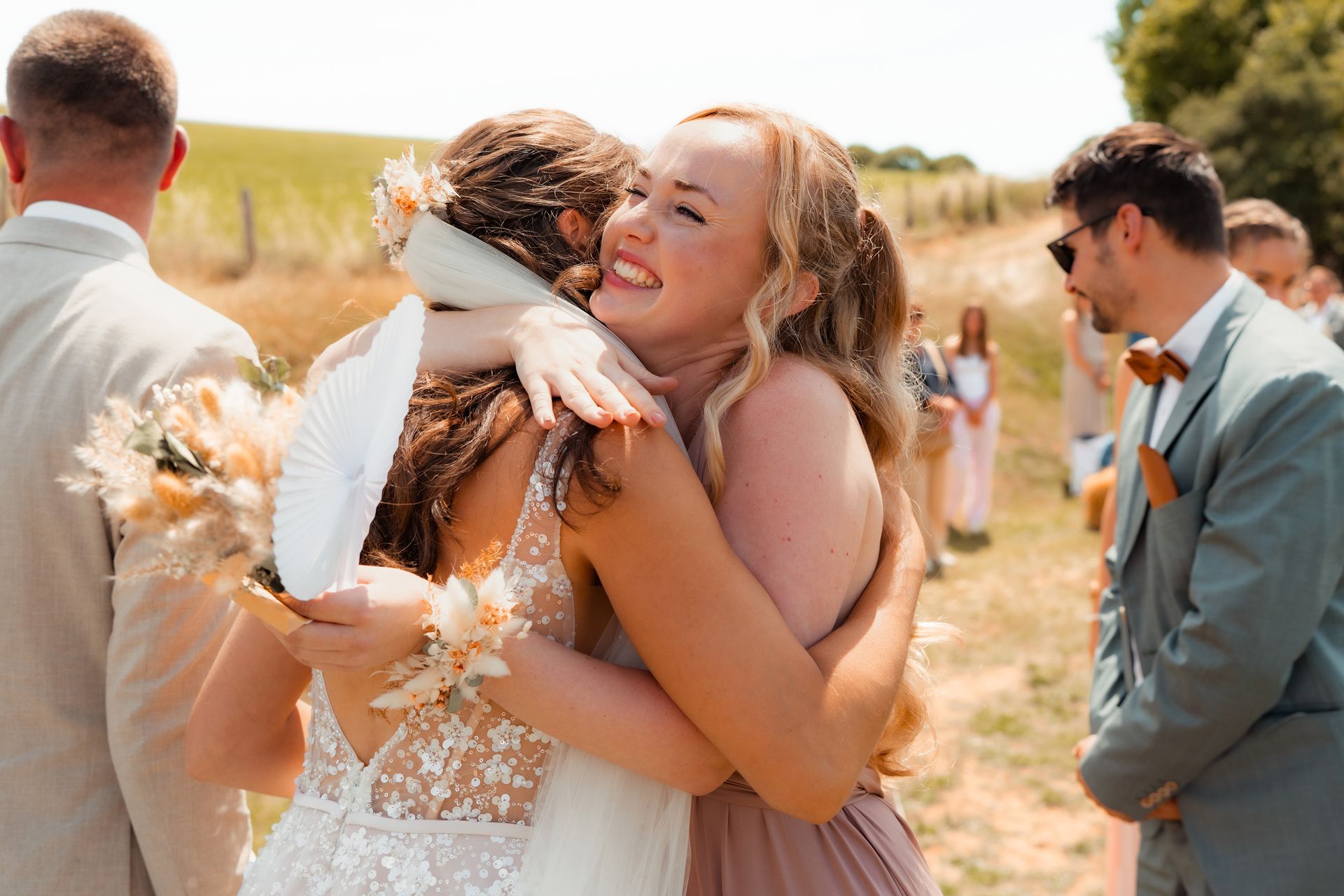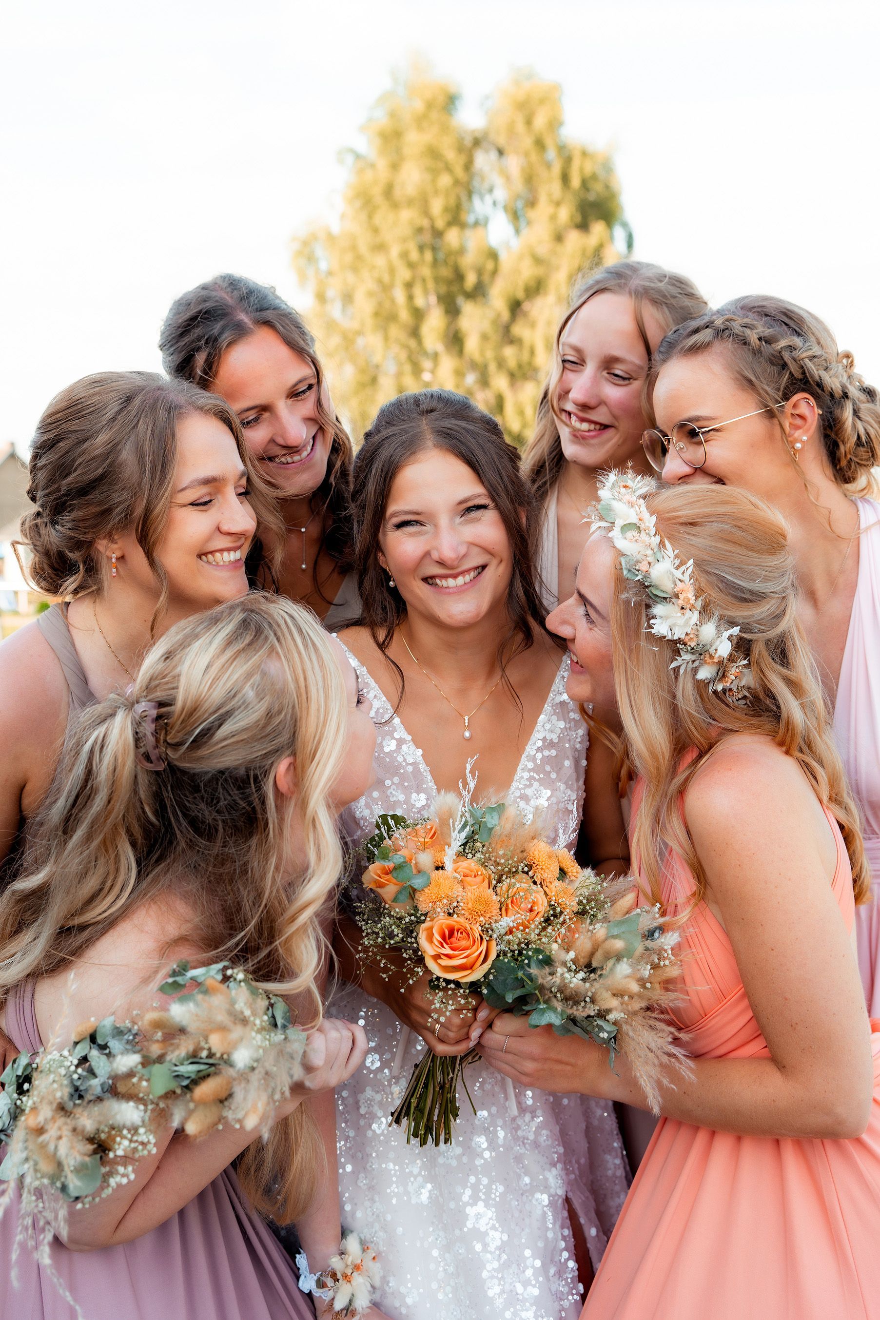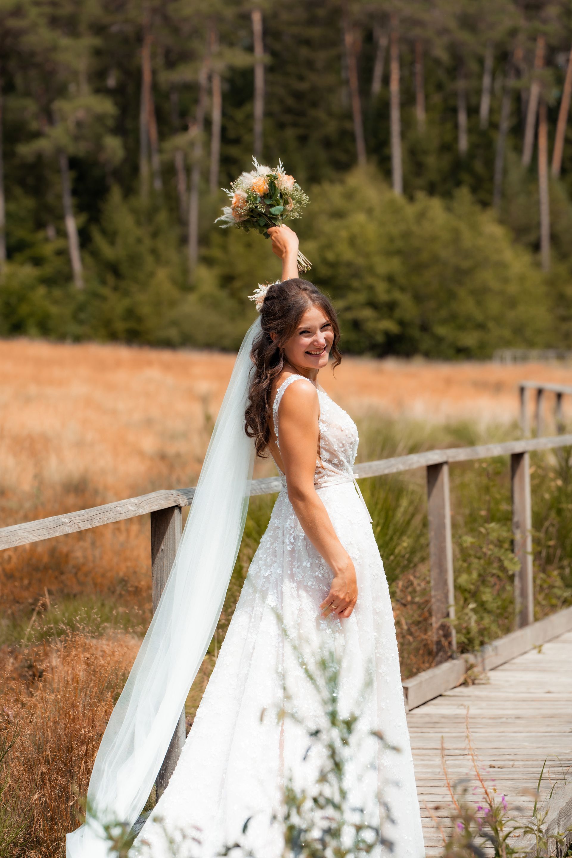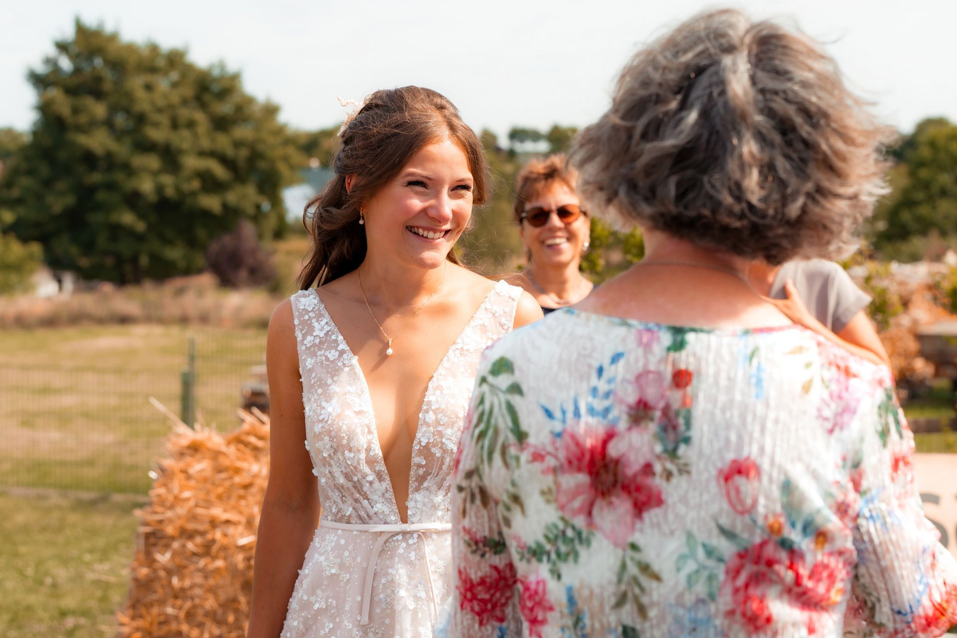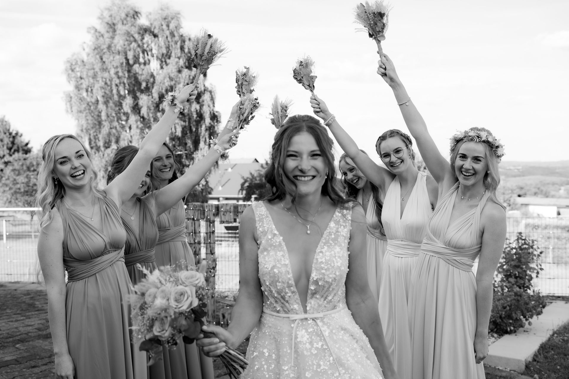 Es gibt Momente im Leben, die man nie vergisst – und die freie Trauung von Maresa und Florian war genau so ein Moment. An einem warmen Sommertag auf einem goldenen Feld in Dahlem trafen sich zwei Herzen zum ersten Mal in diesem ganz besonderen Augenblick. Die Gäste kamen nach und nach an und ich hielt all die kleinen, liebevollen Details fest: das Lächeln beim Ankommen, die freudigen Umarmungen und die strahlenden Augen. Zunächst zogen die Brautjungfern ein, dann die Trauzeugin, bevor Maresa endlich erschien – ein Moment voller Emotion, der allen den Atem raubte. Florian wurde dabei liebevoll von seinem Trauzeugen unterstützt. Die Zeremonie wurde von der wunderbaren