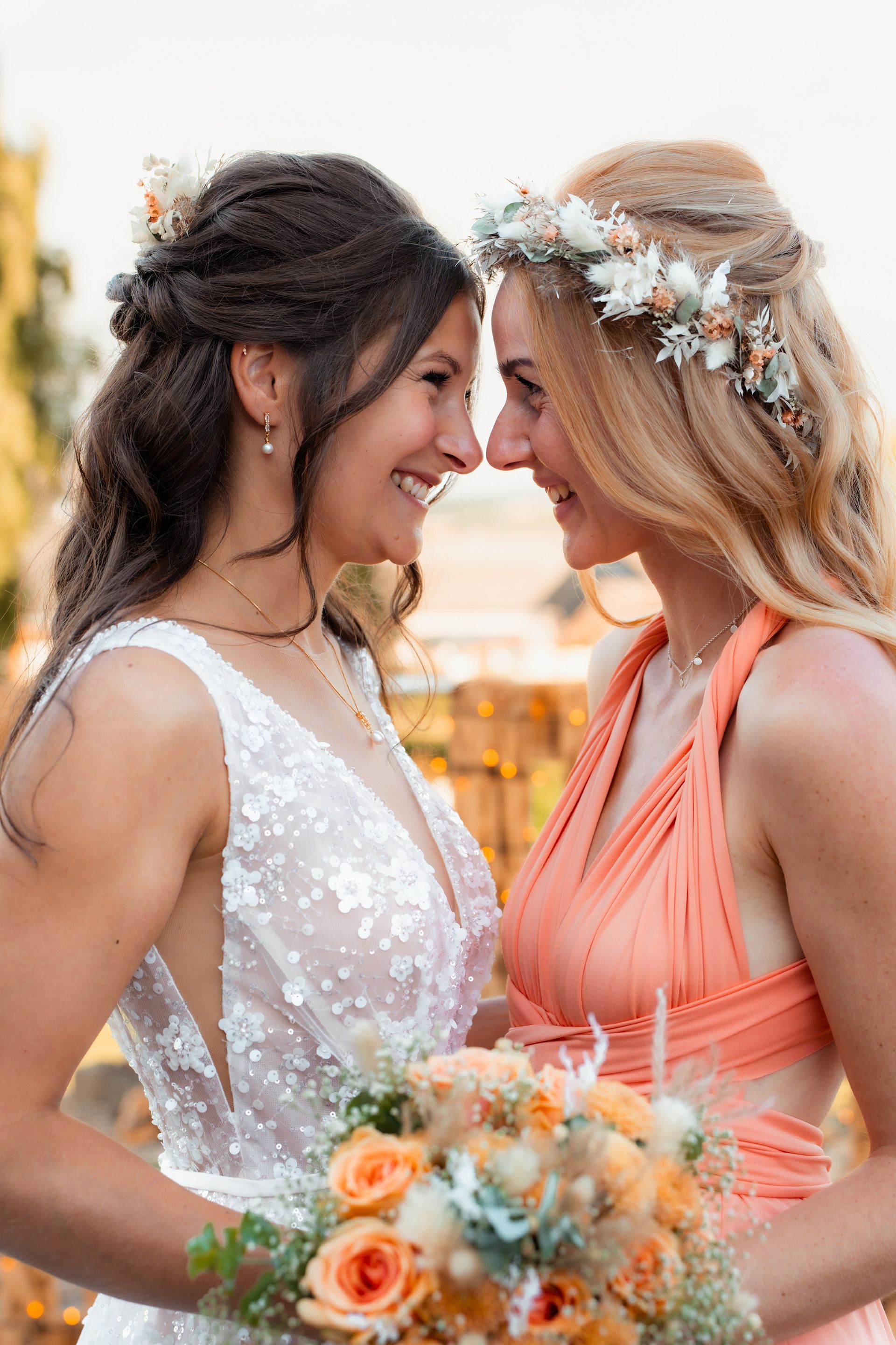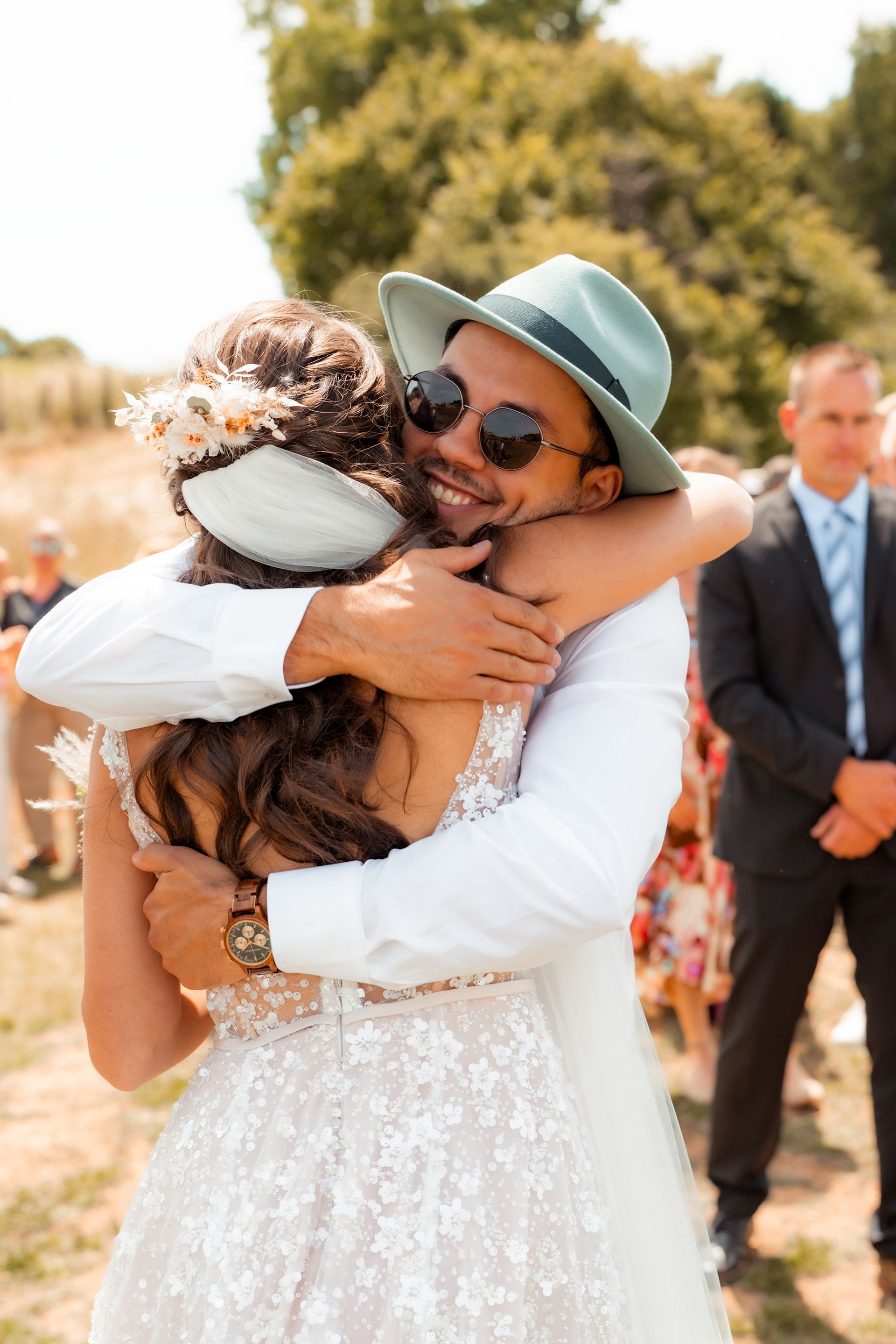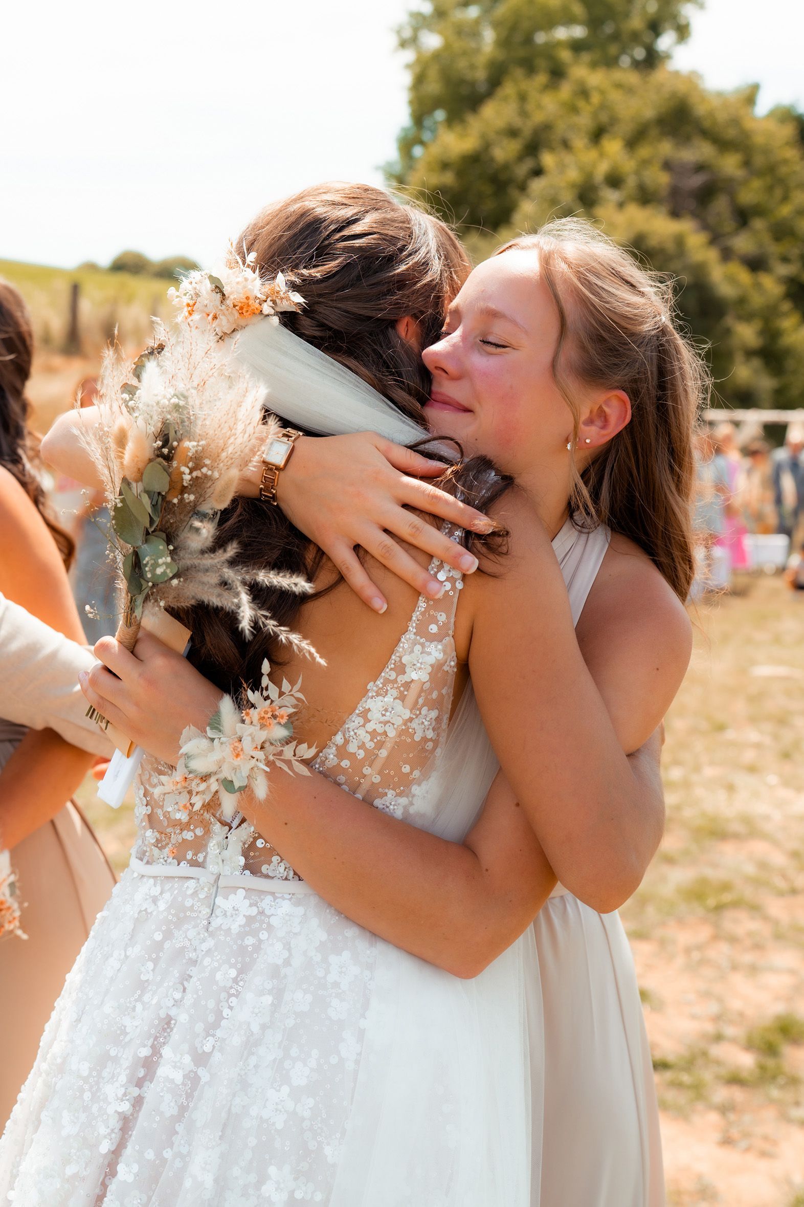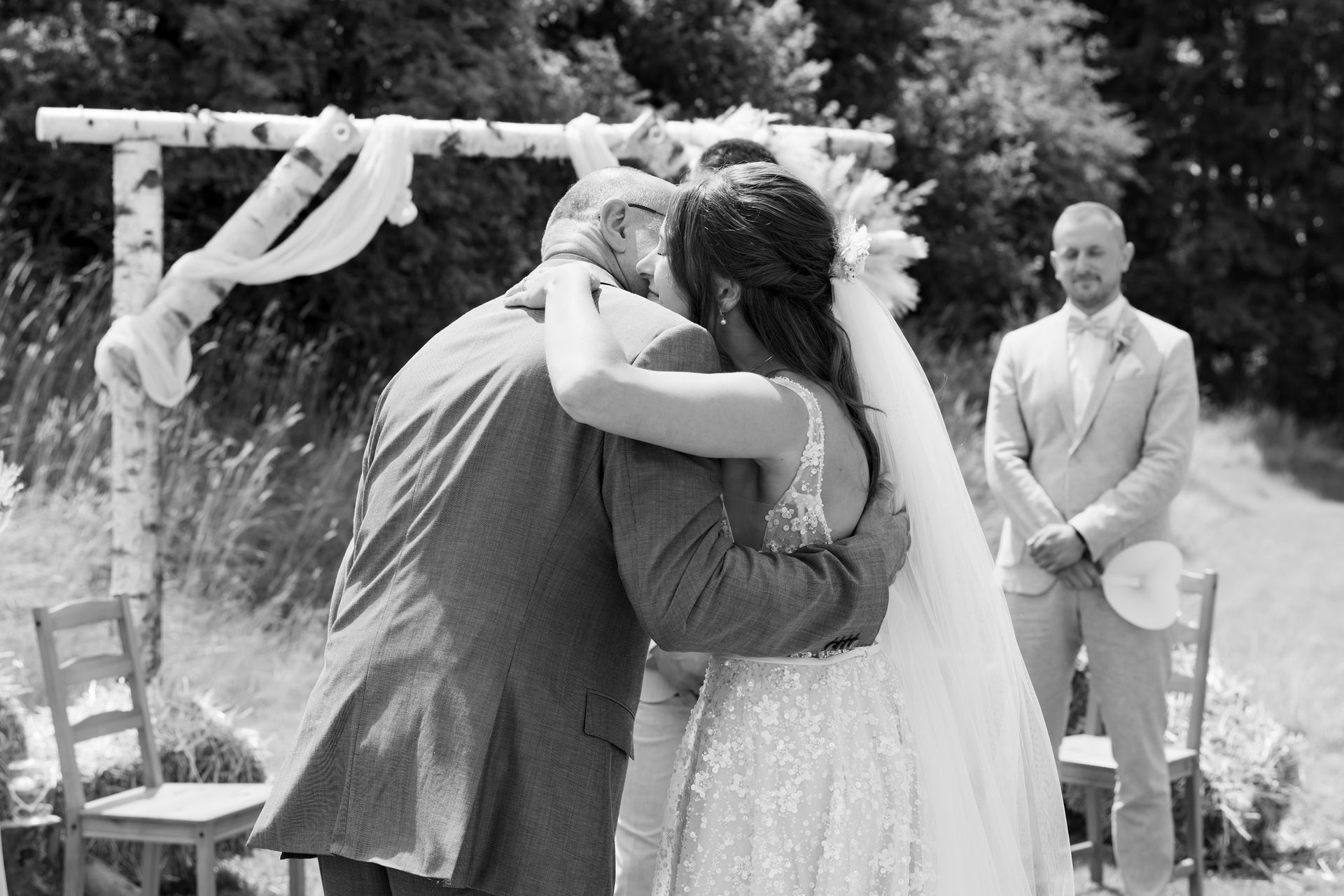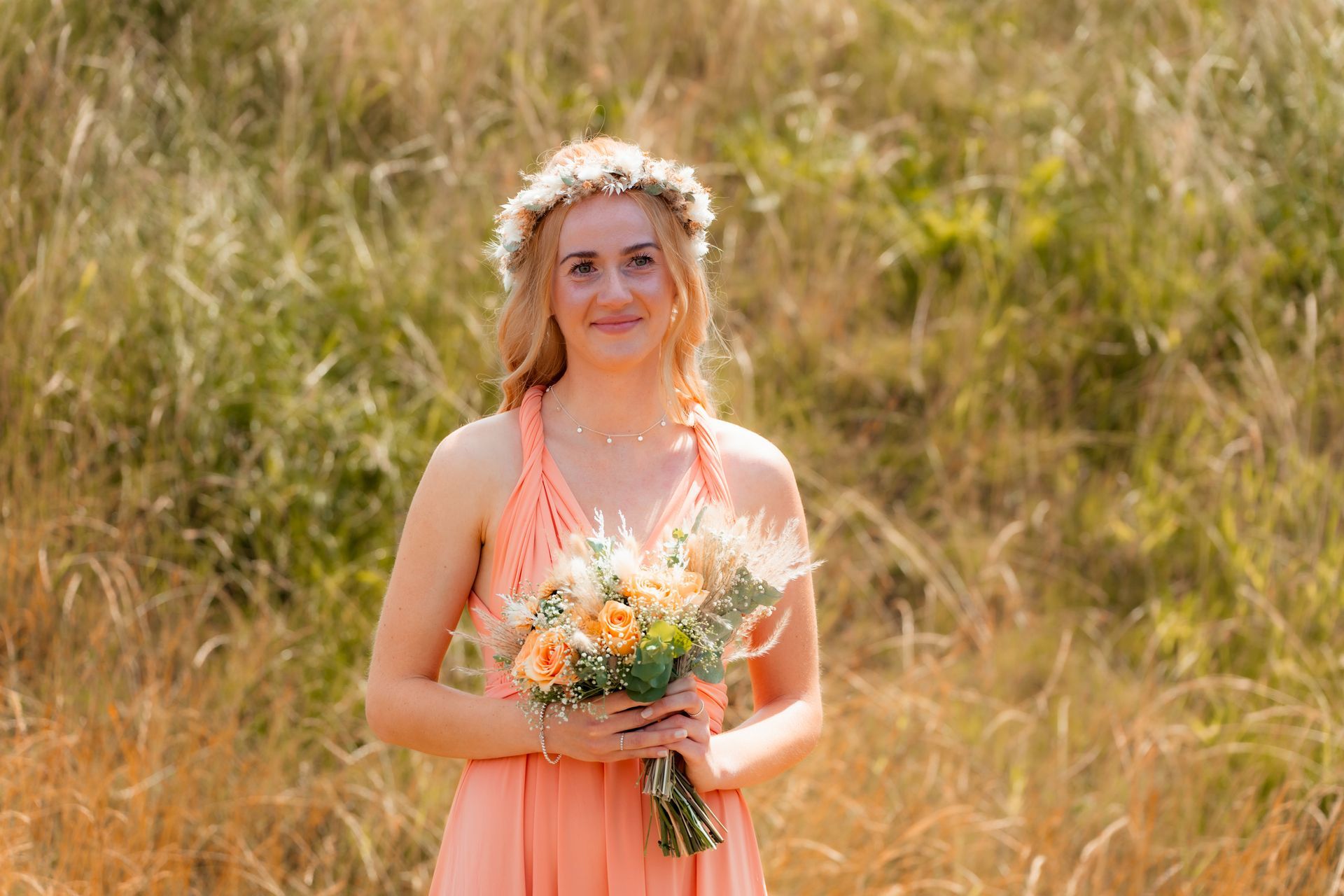Es gibt Momente im Leben, die man nie vergisst – und die freie Trauung von Maresa und Florian war genau so ein Moment. An einem warmen Sommertag auf einem goldenen Feld in Dahlem trafen sich zwei Herzen zum ersten Mal in diesem ganz besonderen Augenblick. Die Gäste kamen nach und nach an und ich hielt all die kleinen, liebevollen Details fest: das Lächeln beim Ankommen, die freudigen Umarmungen und die strahlenden Augen. Zunächst zogen die Brautjungfern ein, dann die Trauzeugin, bevor Maresa endlich erschien – ein Moment voller Emotion, der allen den Atem raubte. Florian wurde dabei liebevoll von seinem Trauzeugen unterstützt. Die Zeremonie wurde von der wunderbaren