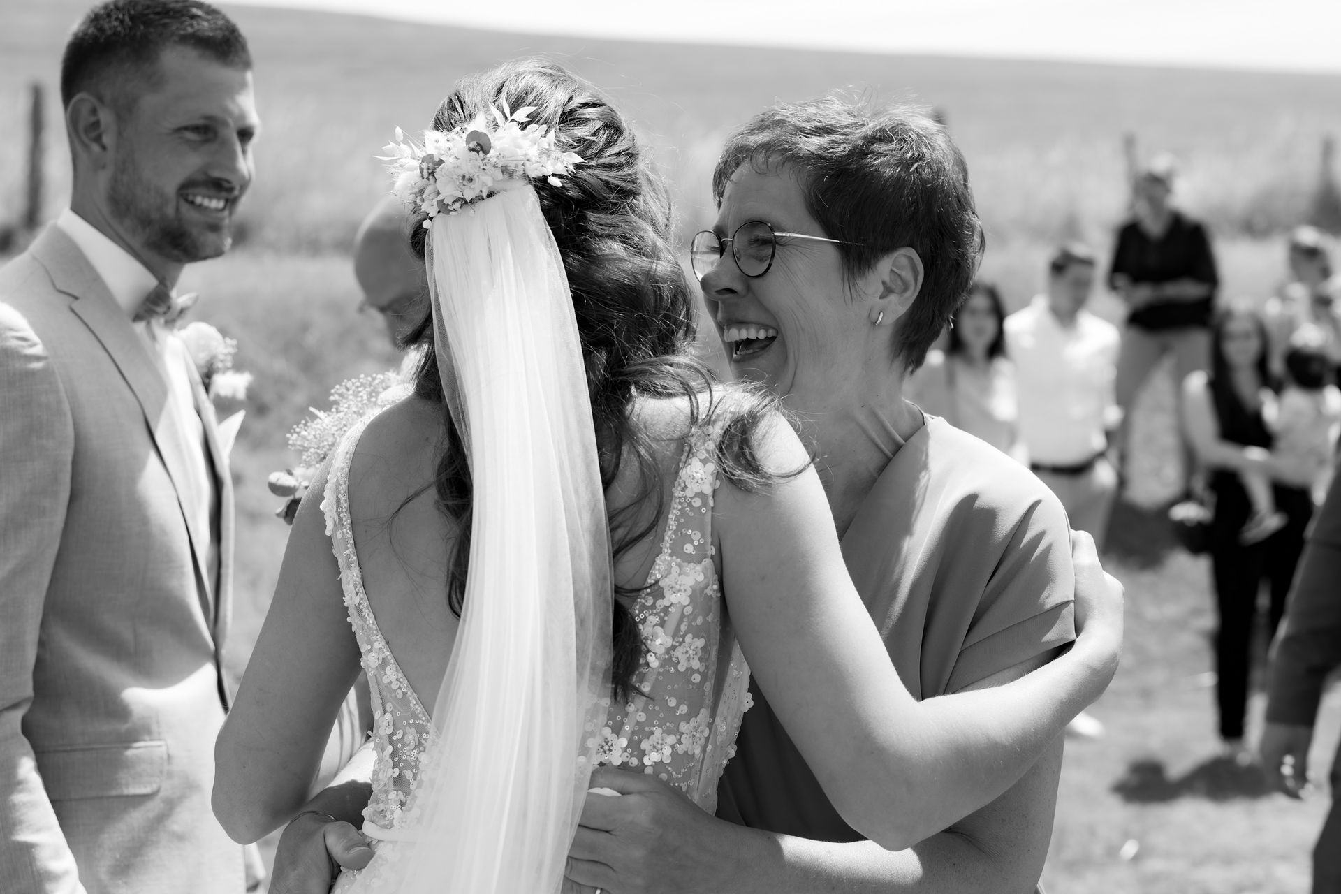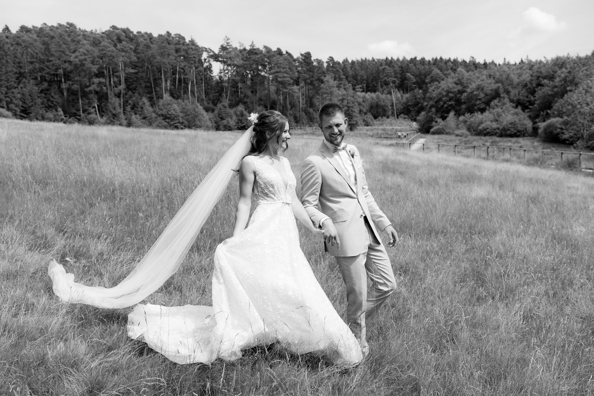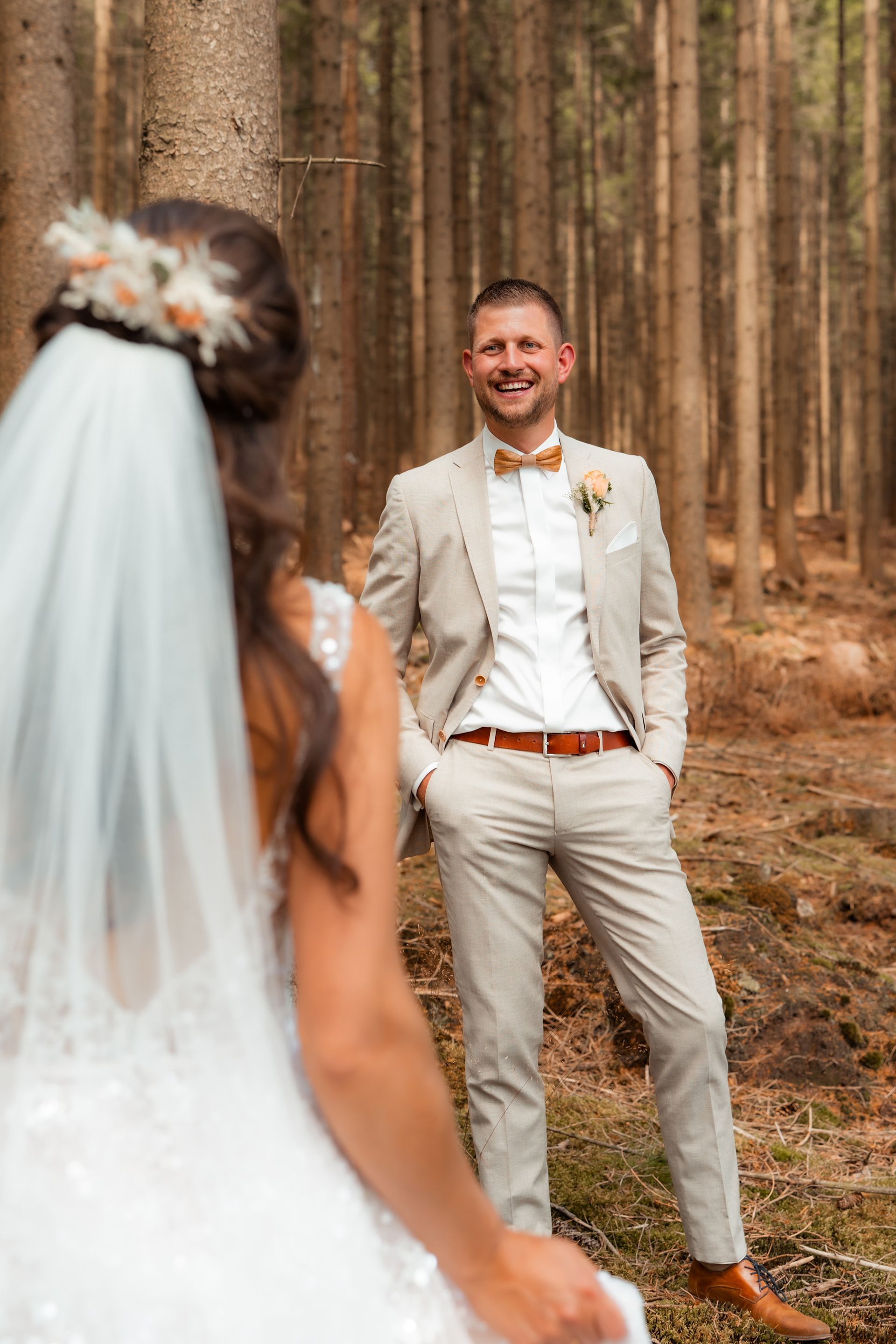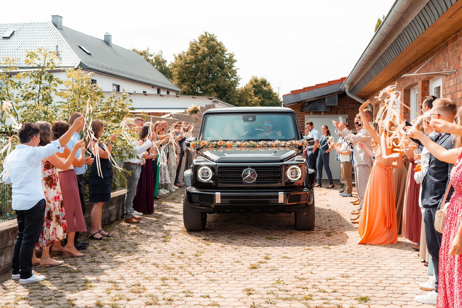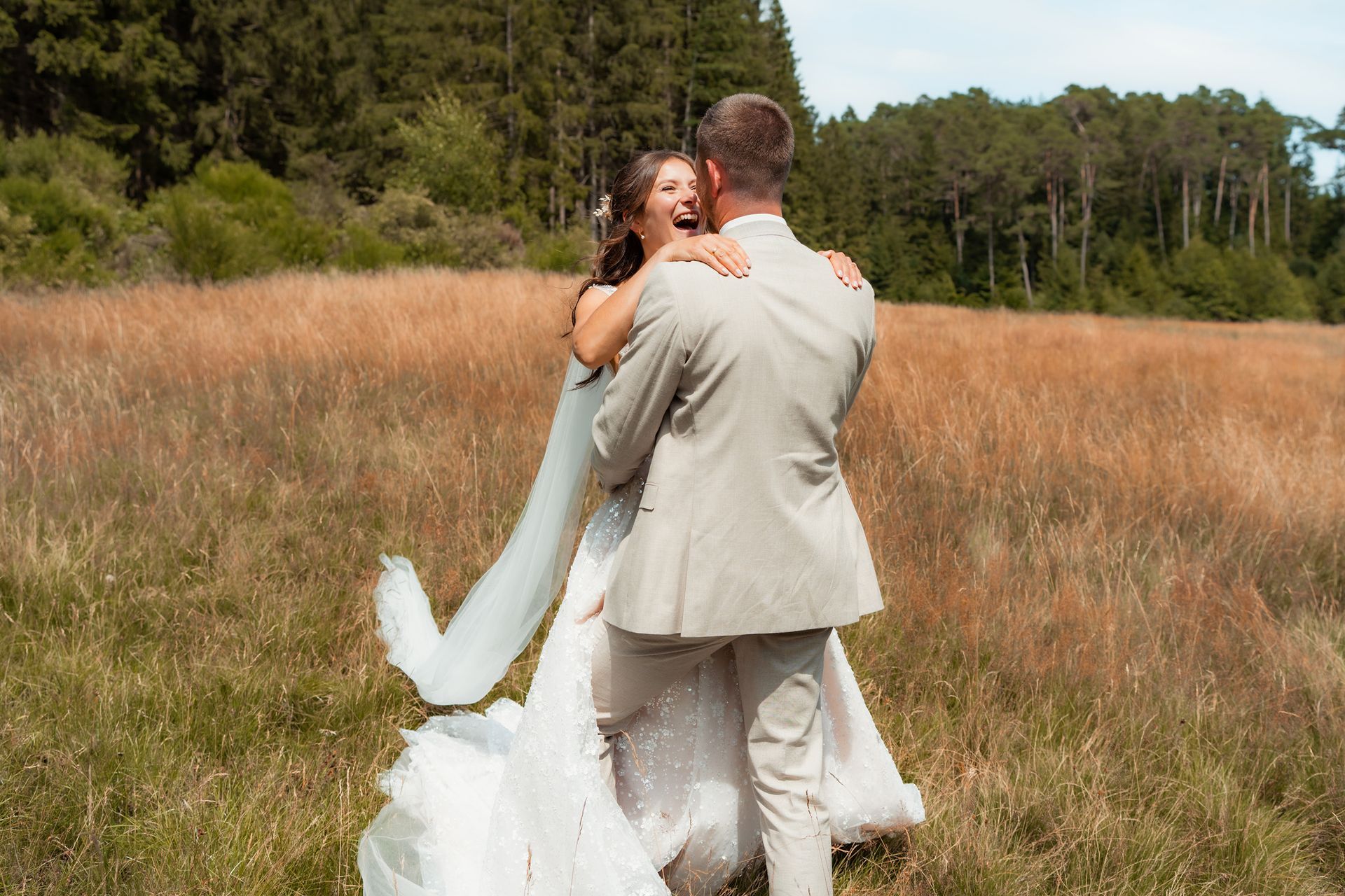 Für das Paarshooting fuhren wir zu einem Ort, der auf dem Weg zur Location lag, während die Gäste schon zum Sektempfang in den Dorfsaal Schöneseiffen gebracht wurden. Dort wurden Maresa und Florian mit Applaus und Seifenblasen empfangen – ein fröhlicher, unvergesslicher Moment voller Lachen und Freude.