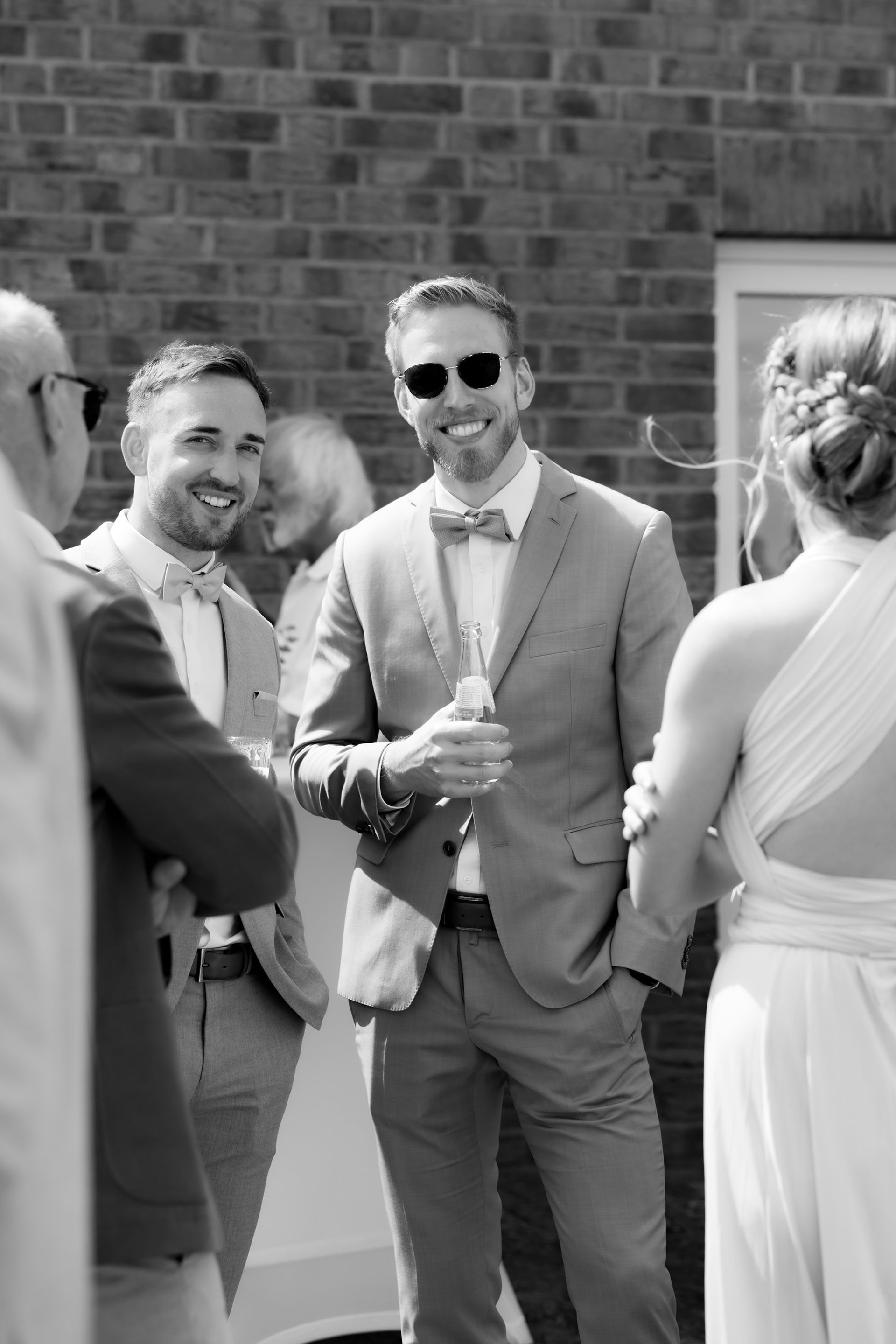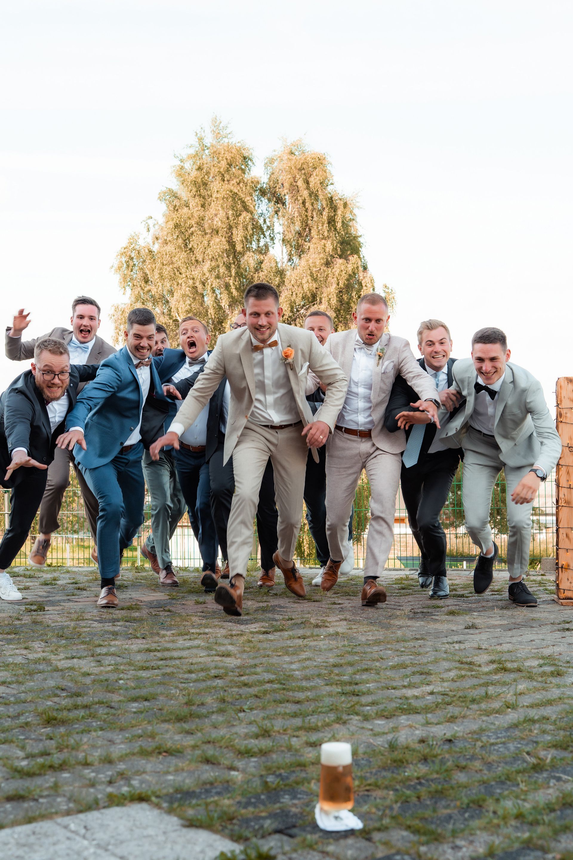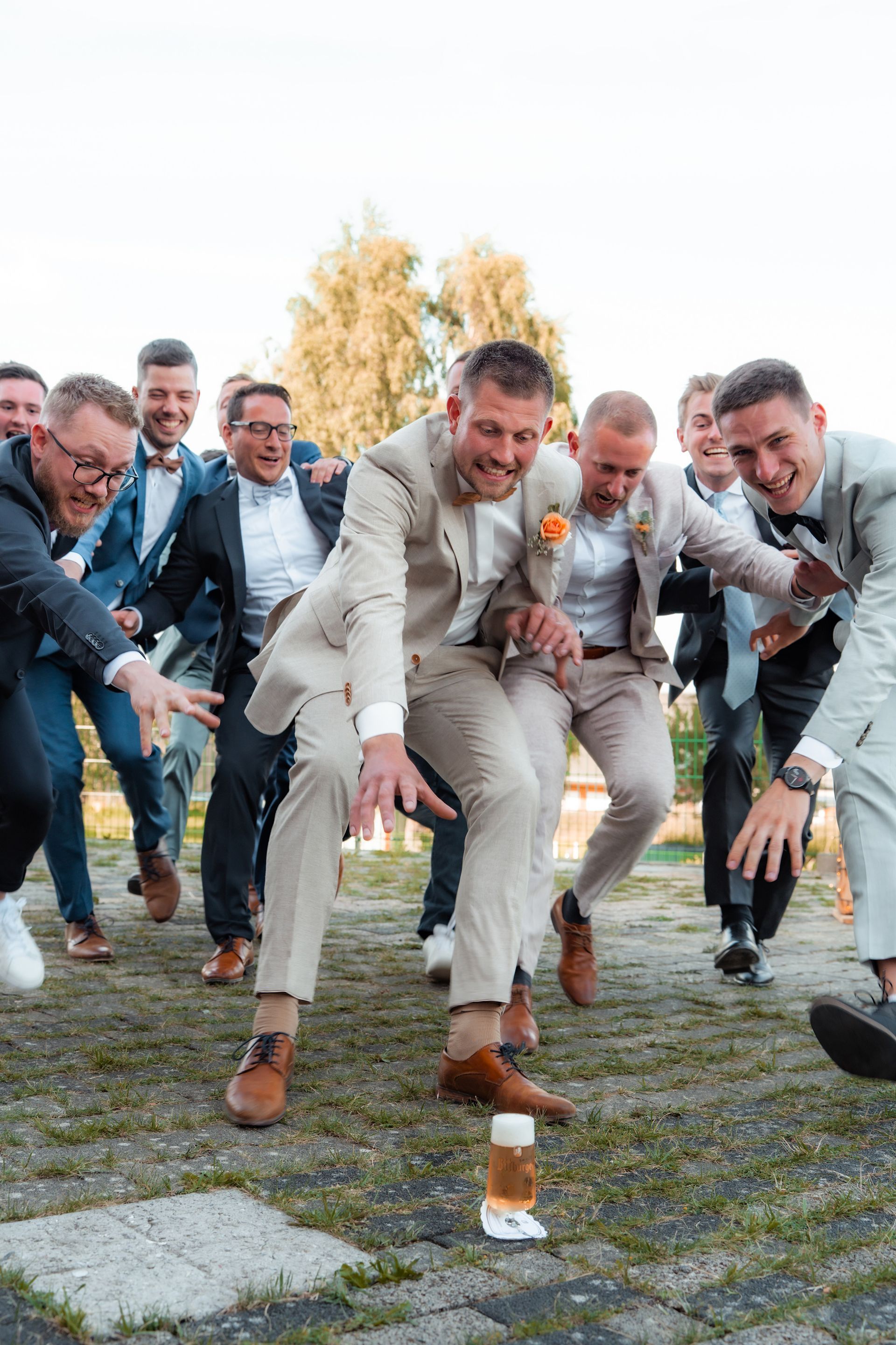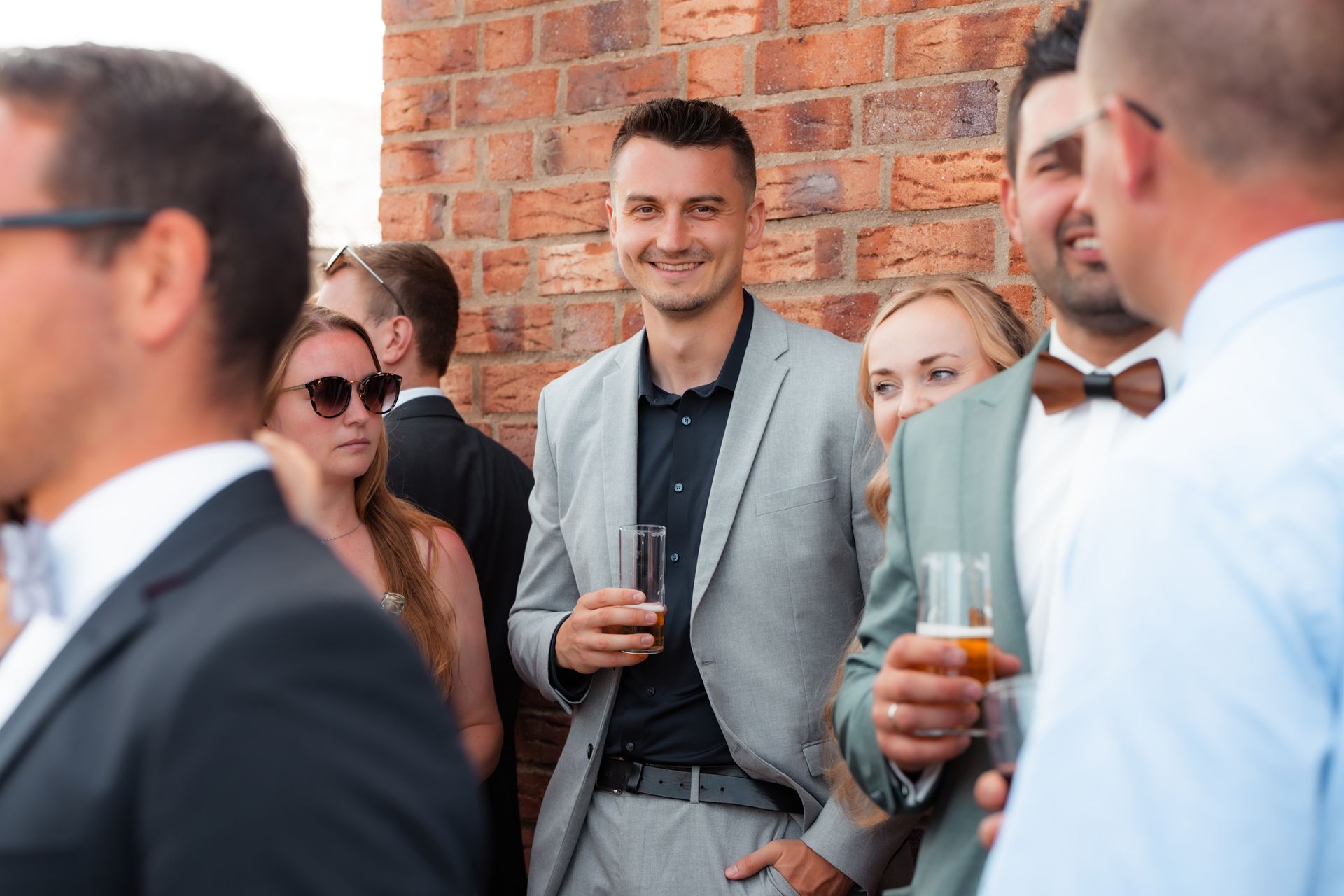Beim Empfang entstanden liebevolle Gruppenbilder, lustige Aktionen wie das Hochwerfen des Bräutigams oder ein Bierwettrennen und viele persönliche Fotos mit Brautjungfern und Trauzeugin. Bevor das Abendessen begann, hielt ich noch stimmungsvolle Details, die Location und die Gäste fotografisch fest, um die besondere Atmosphäre dieses Tages einzufangen.