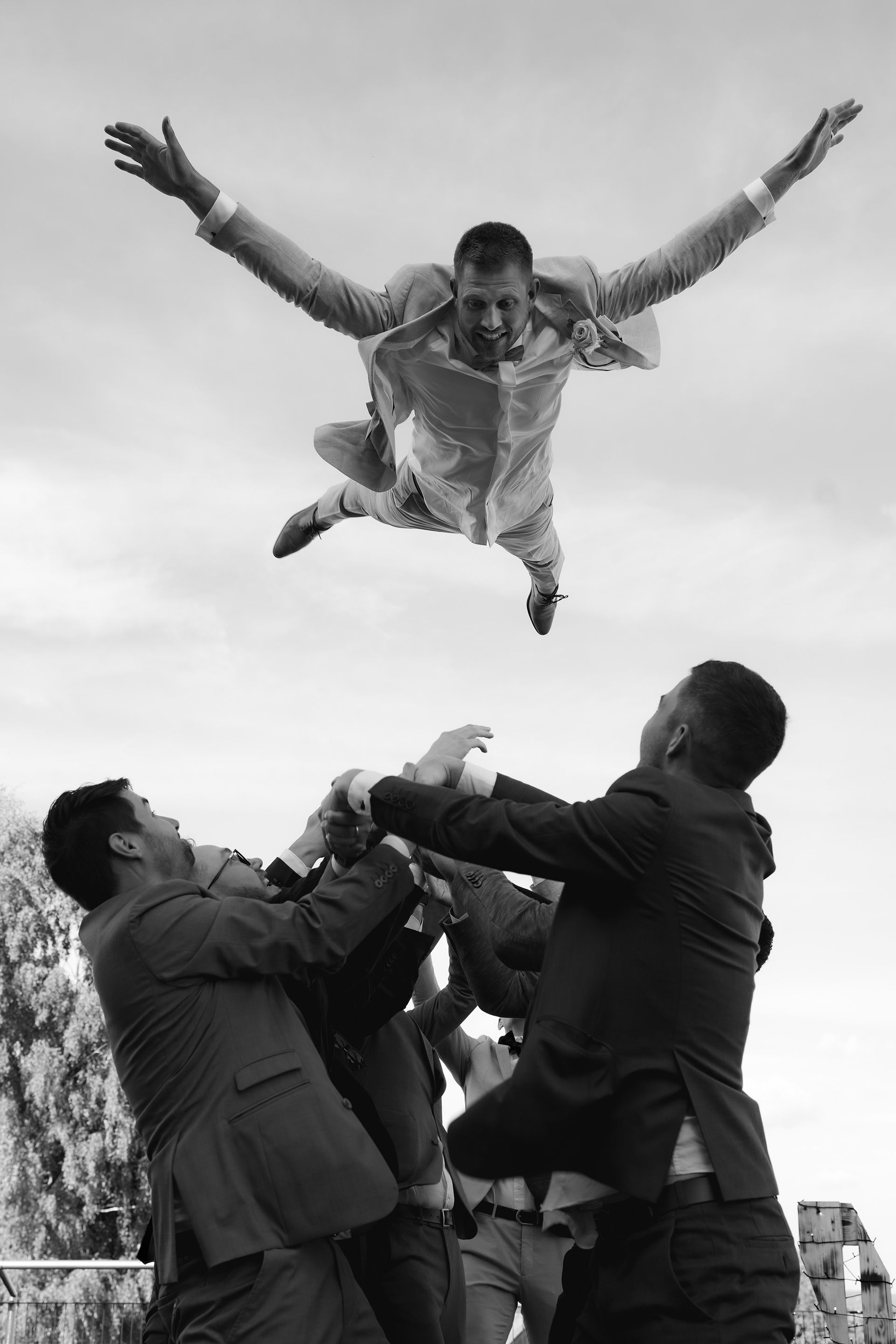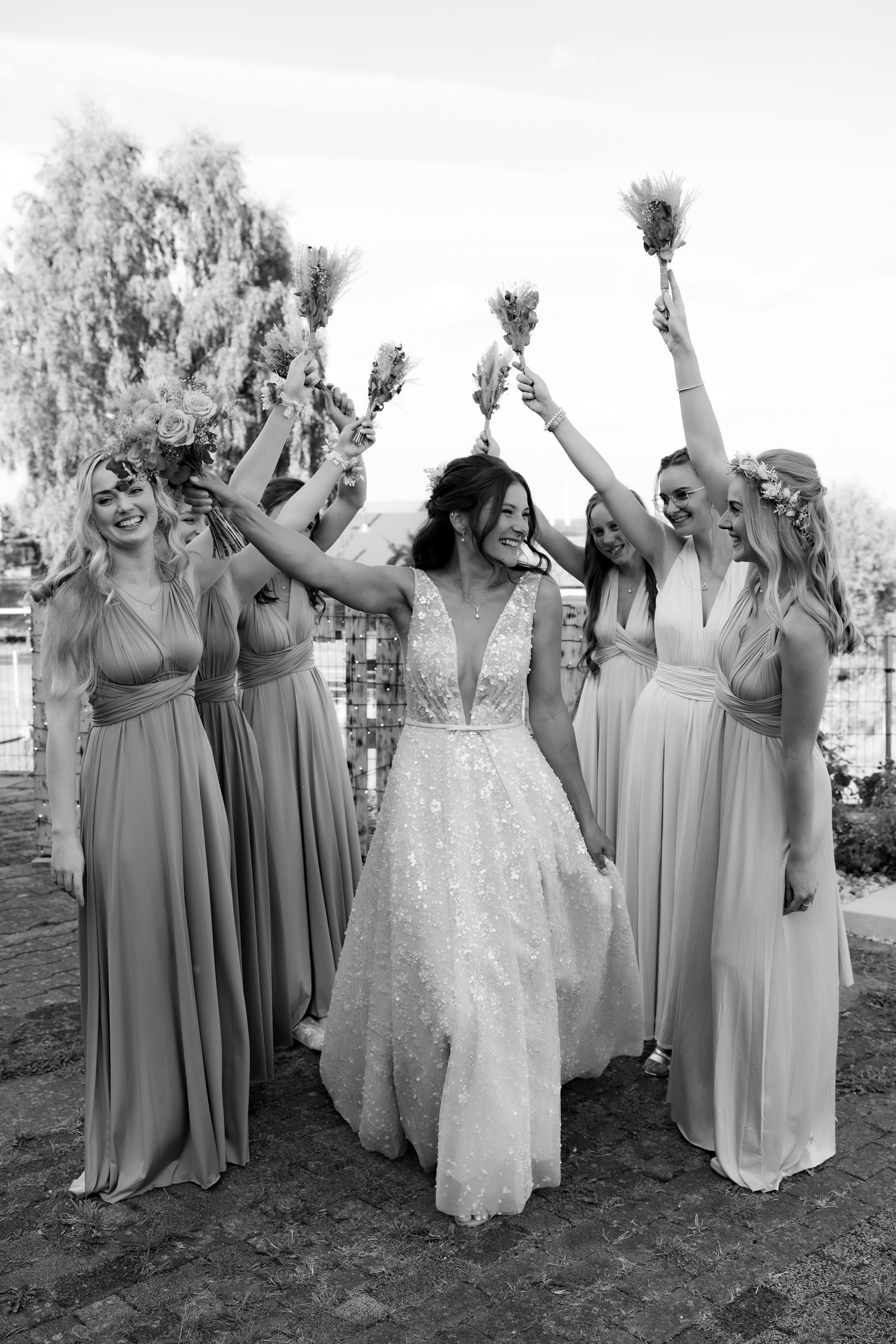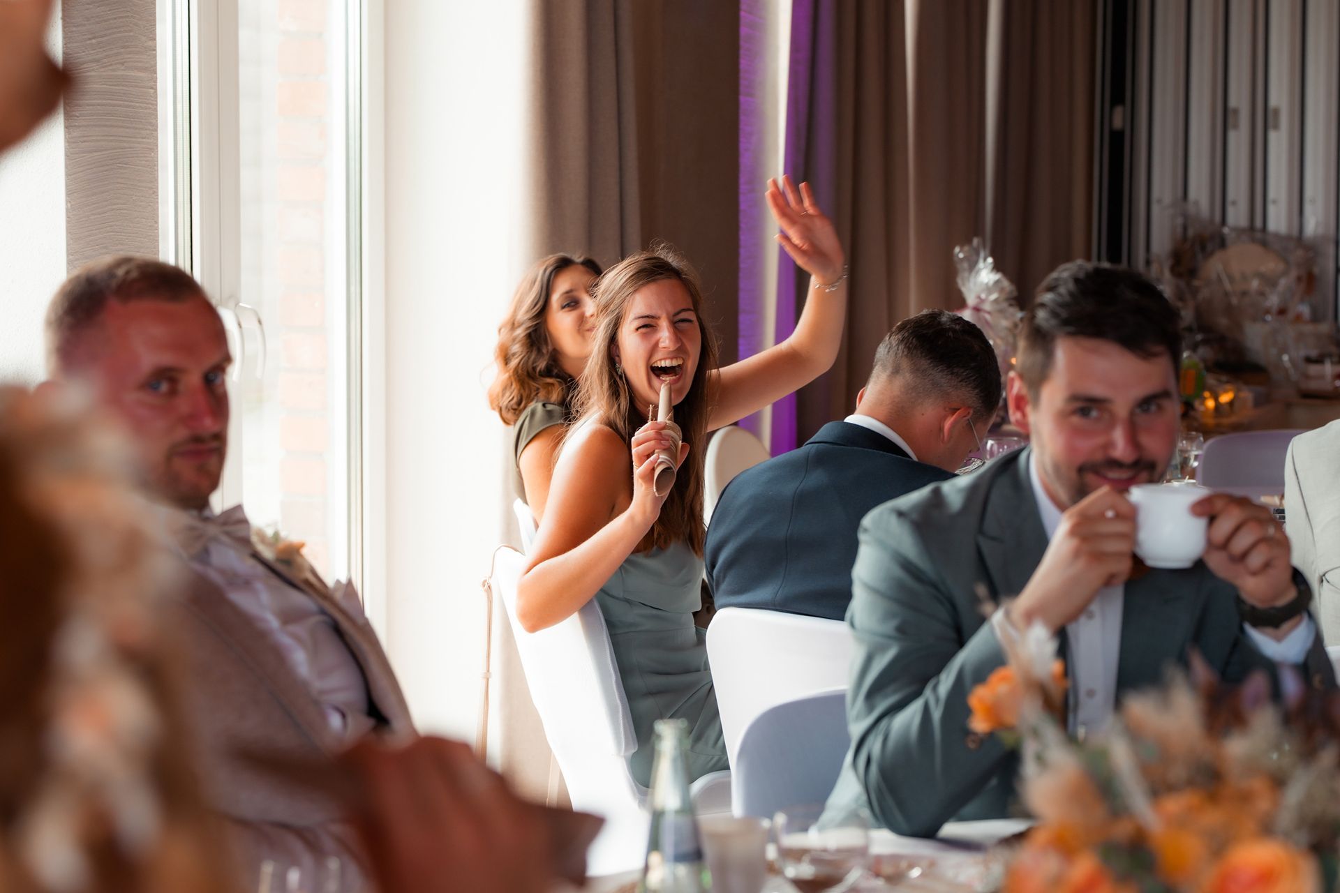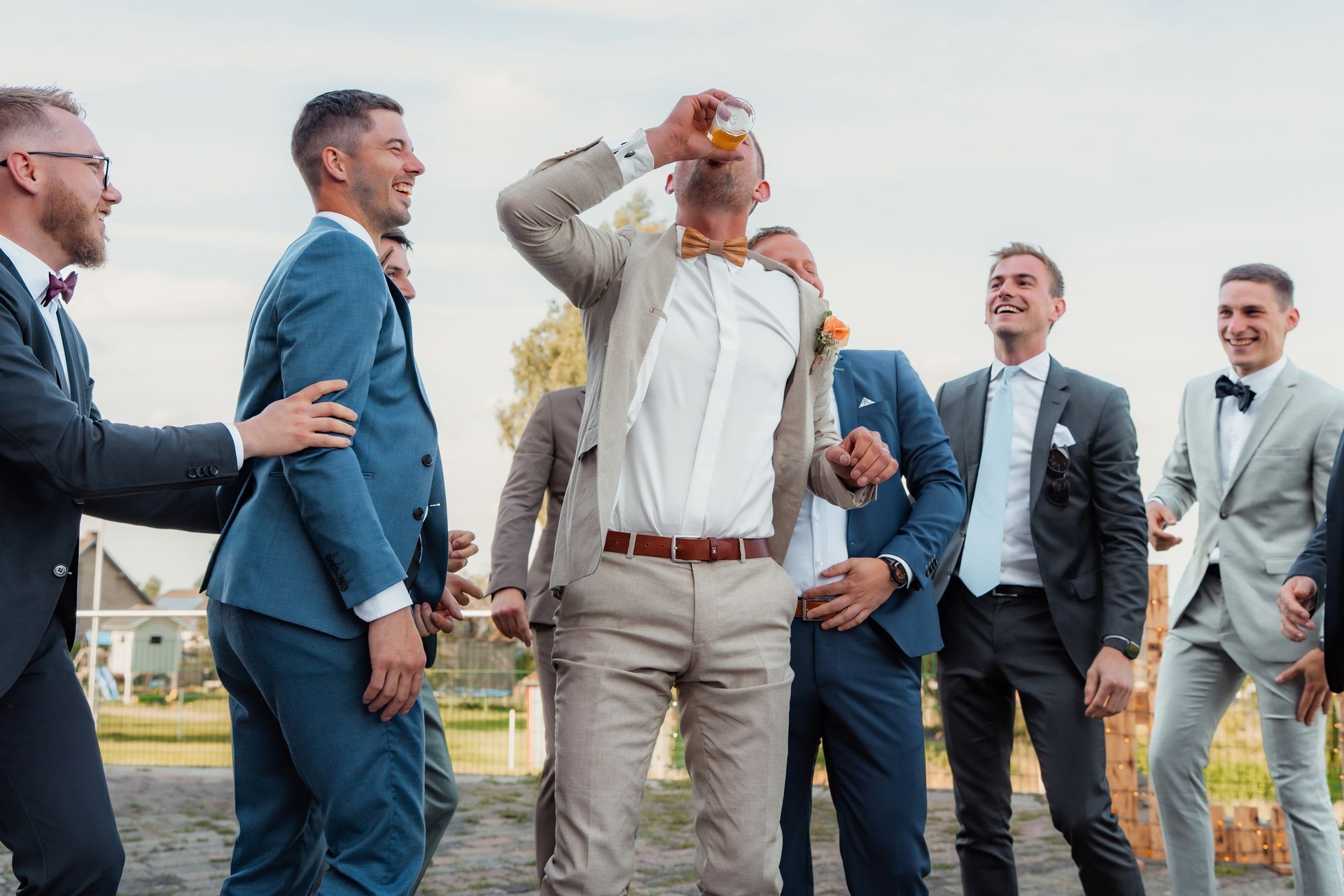 Beim Empfang entstanden liebevolle Gruppenbilder, lustige Aktionen wie das Hochwerfen des Bräutigams oder ein Bierwettrennen und viele persönliche Fotos mit Brautjungfern und Trauzeugin. Bevor das Abendessen begann, hielt ich noch stimmungsvolle Details, die Location und die Gäste fotografisch fest, um die besondere Atmosphäre dieses Tages einzufangen.