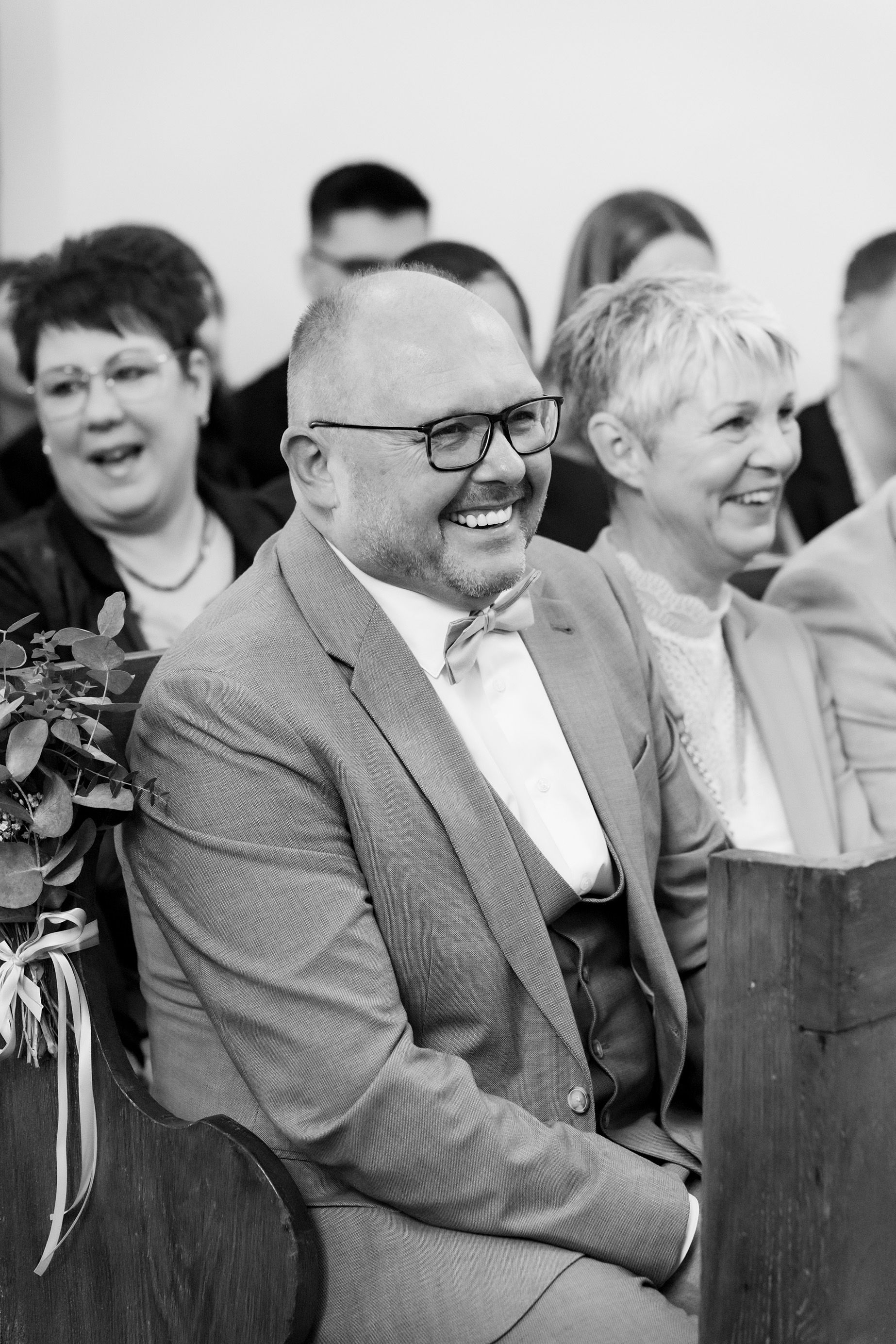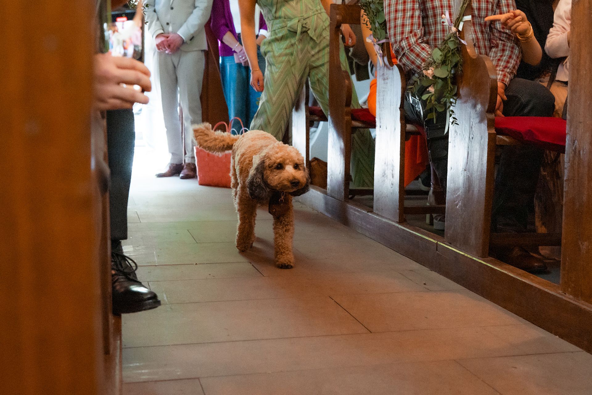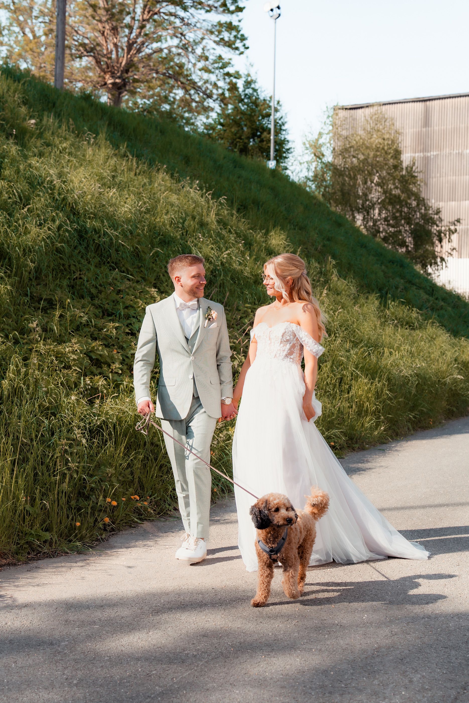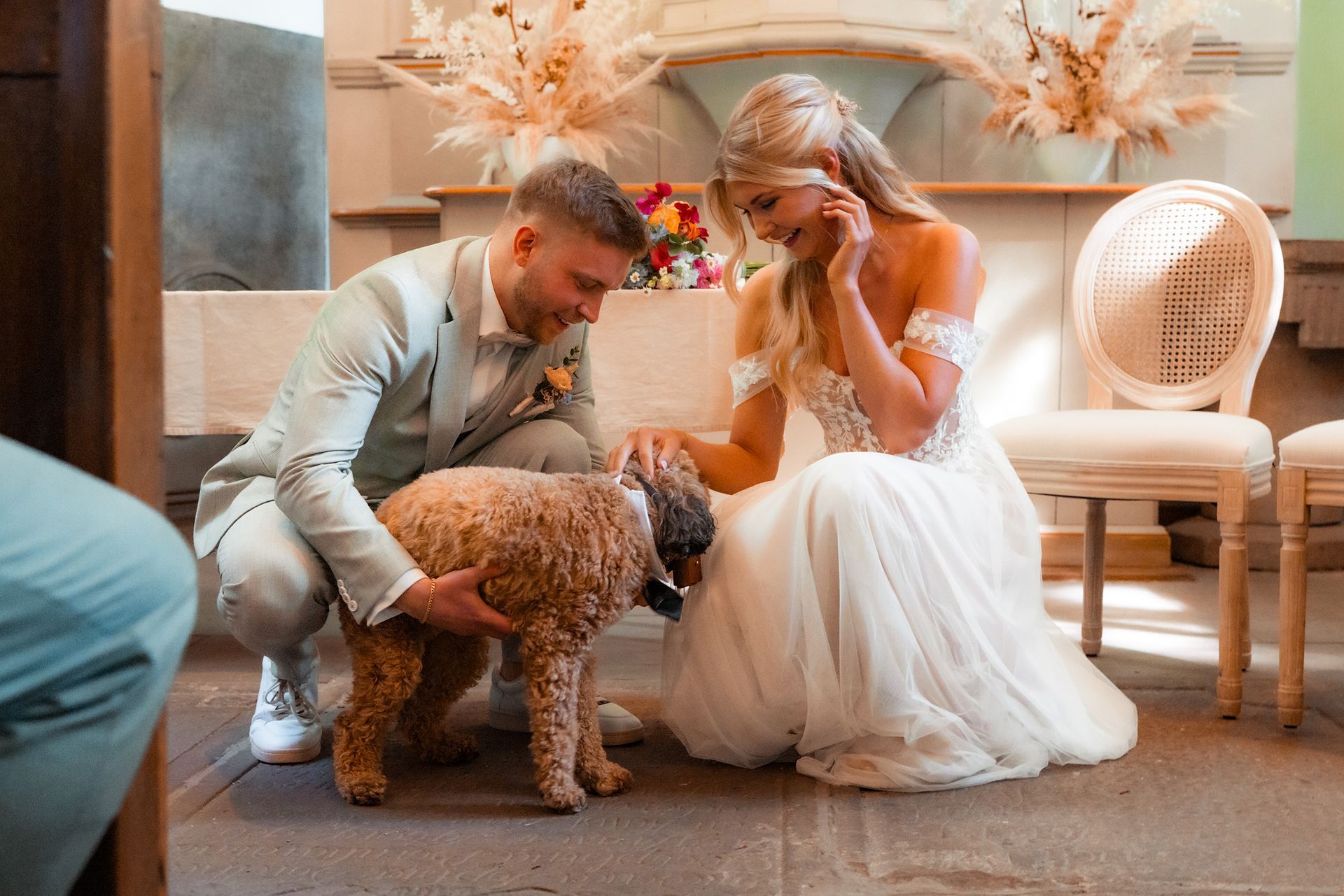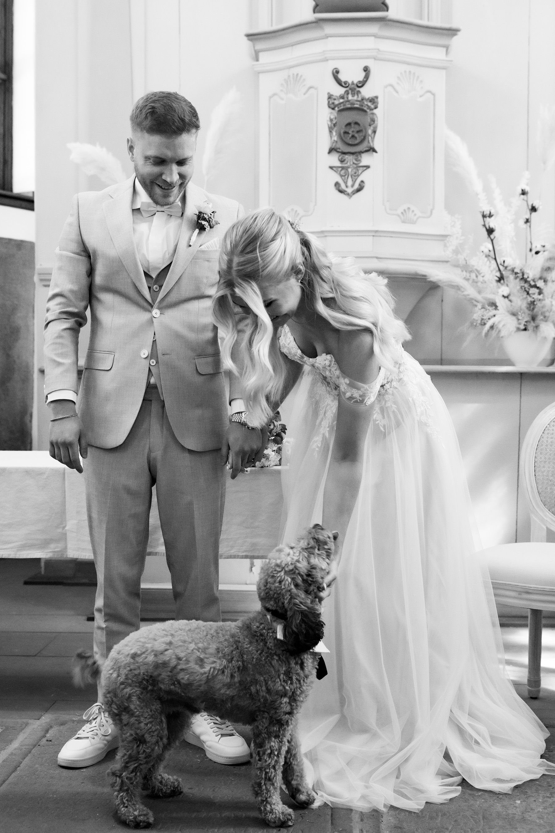 Die Zeremonie war voller Gefühl, wunderschön geleitet von einer tollen Traurednerin. Ein echtes Highlight: Hund Toni, der Herzenshund des Brautpaares, brachte Hanna und Stefan die Ringe – ein unvergesslicher Augenblick, der allen Gästen ein Lächeln ins Gesicht zauberte. Nach der Trauung folgten Gratulationen und ein kleiner Sektempfang vor der Kapelle, bevor wir uns für das Brautpaarshooting Zeit nahmen und romantische, lebendige Bilder entstanden.