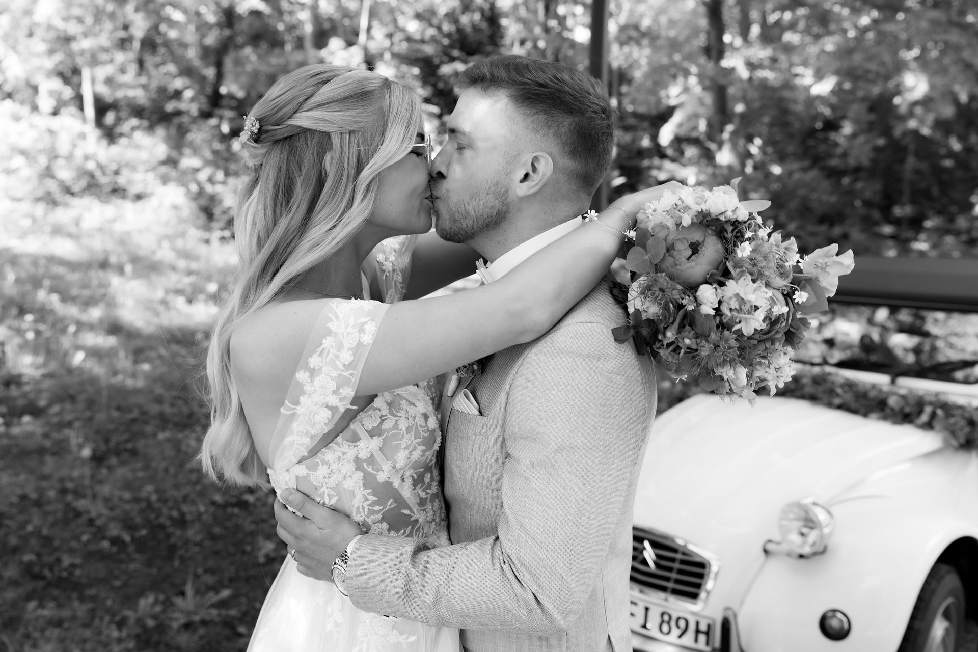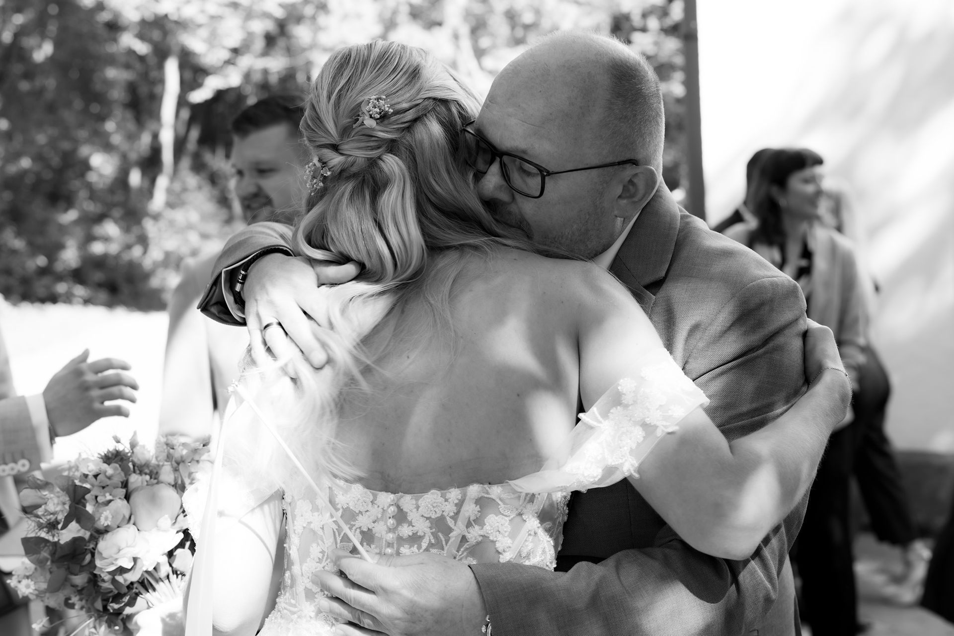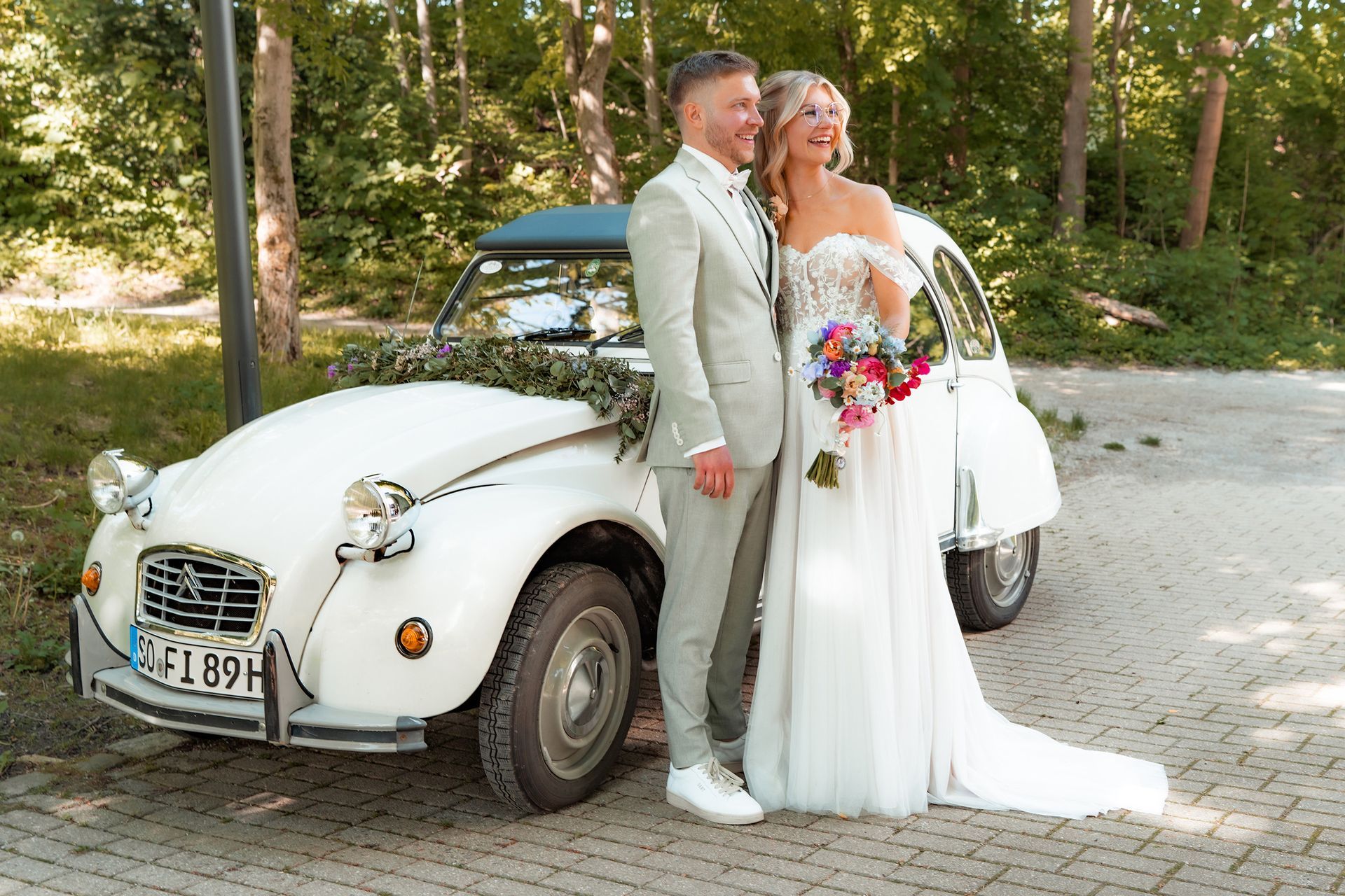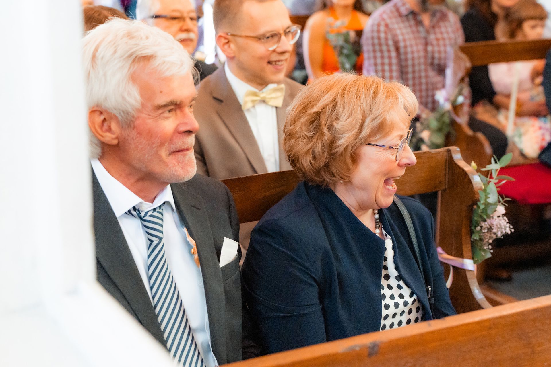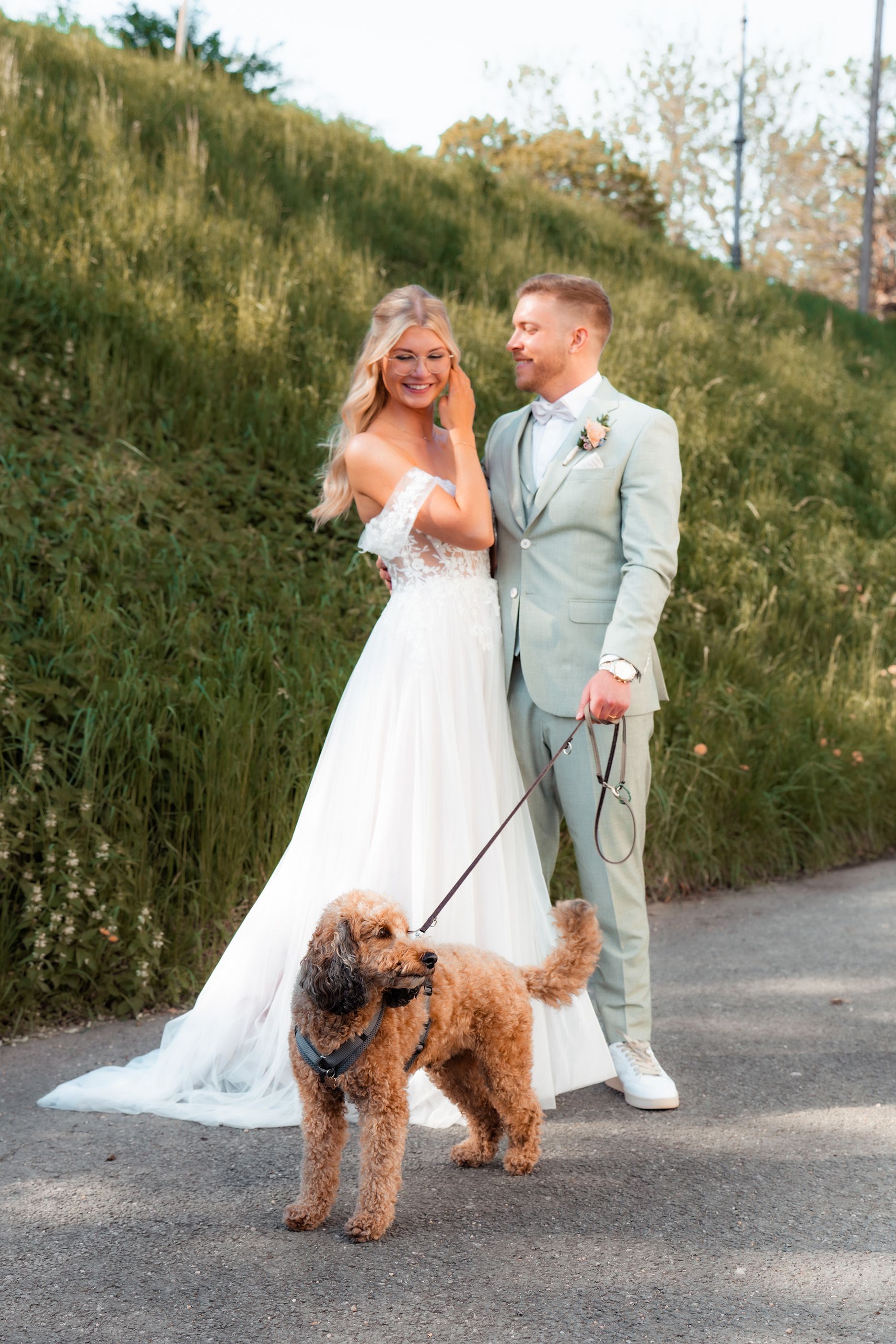 Die Zeremonie war voller Gefühl, wunderschön geleitet von einer tollen Traurednerin. Ein echtes Highlight: Hund Toni, der Herzenshund des Brautpaares, brachte Hanna und Stefan die Ringe – ein unvergesslicher Augenblick, der allen Gästen ein Lächeln ins Gesicht zauberte. Nach der Trauung folgten Gratulationen und ein kleiner Sektempfang vor der Kapelle, bevor wir uns für das Brautpaarshooting Zeit nahmen und romantische, lebendige Bilder entstanden.